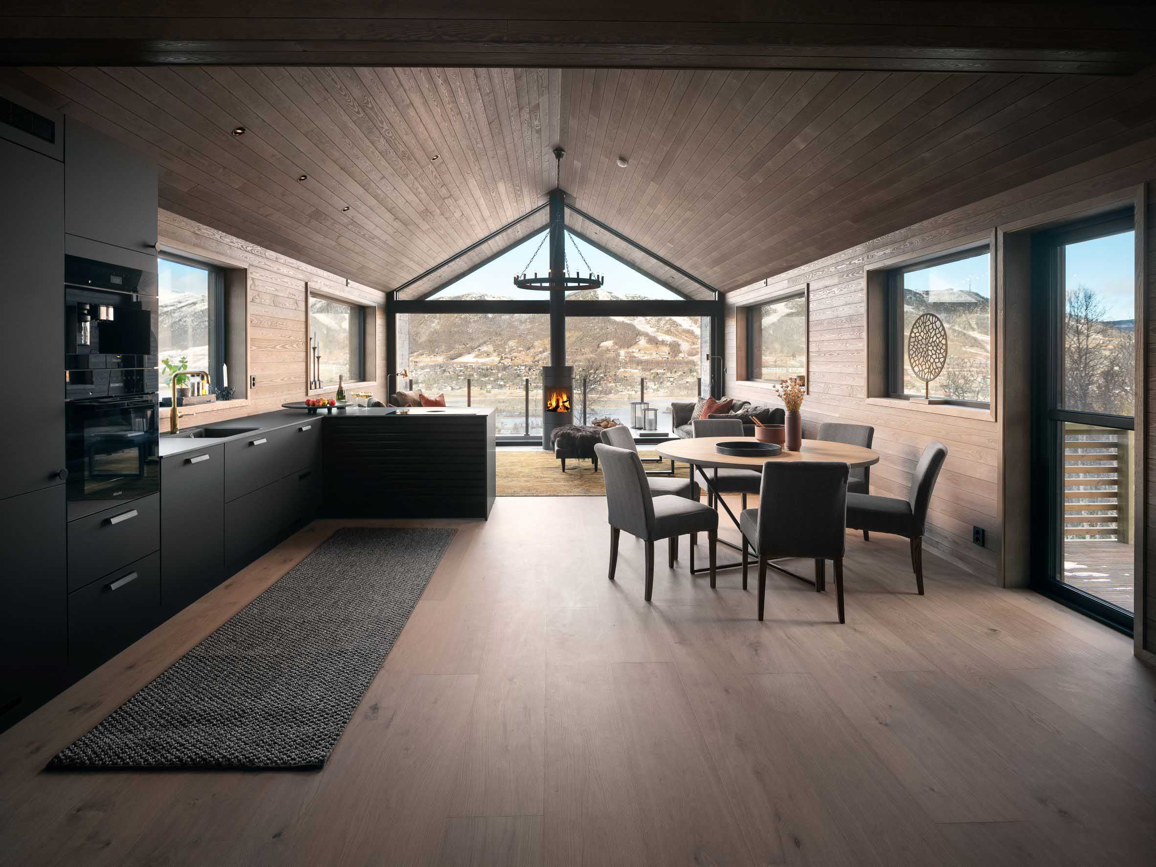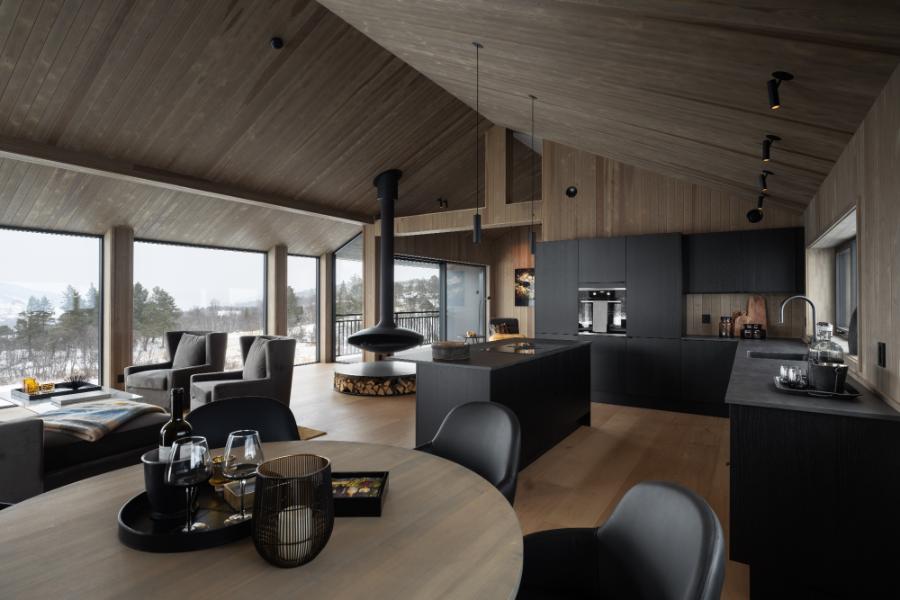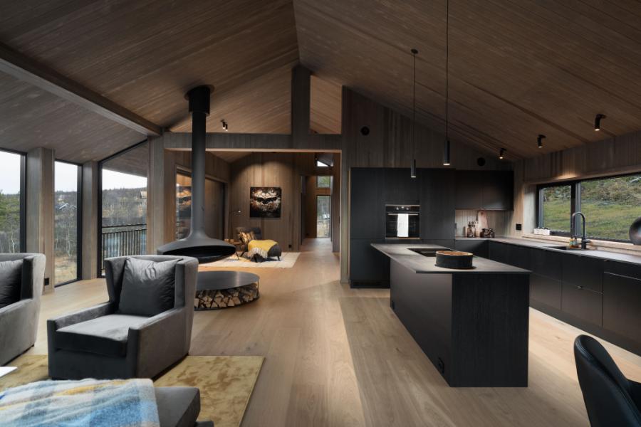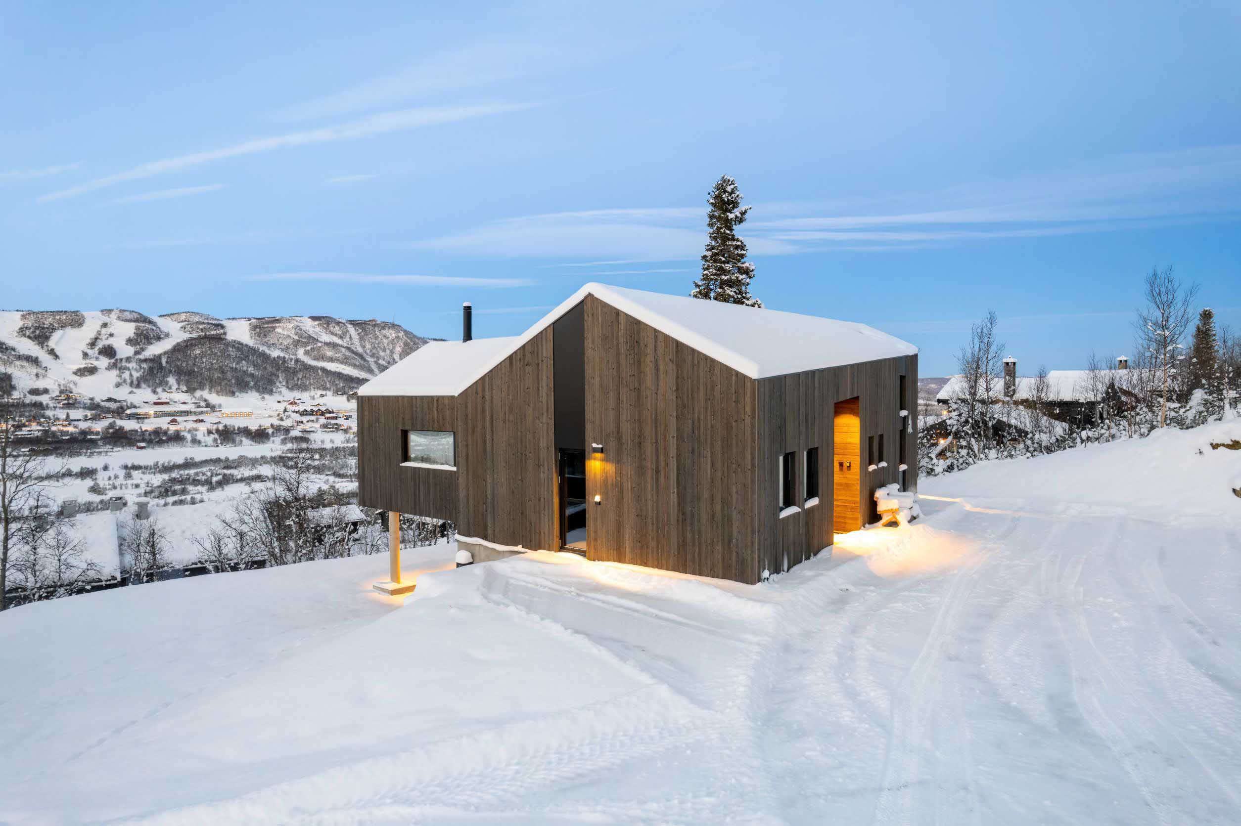 De skrå, men enkle formene gjør at hyttene glir godt inn i landskapet på en god og naturlig måte. Formene er blant annet inspirert av en snøplog, og den sømløse arkitekturen skaper et inntrykk av et robust bygg som tåler vær og vind. Store vindusflater og god takhøyde gir følelse av luft og fjell.