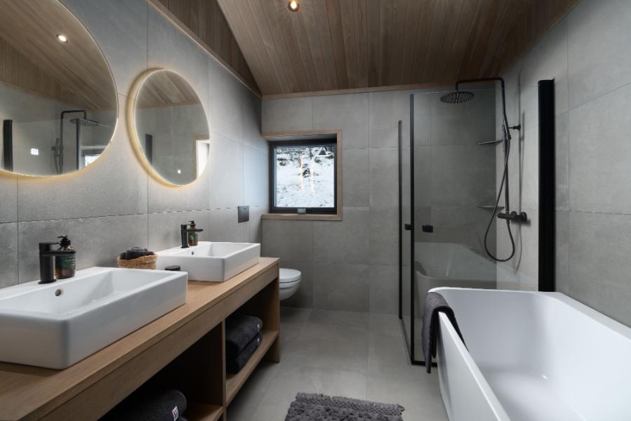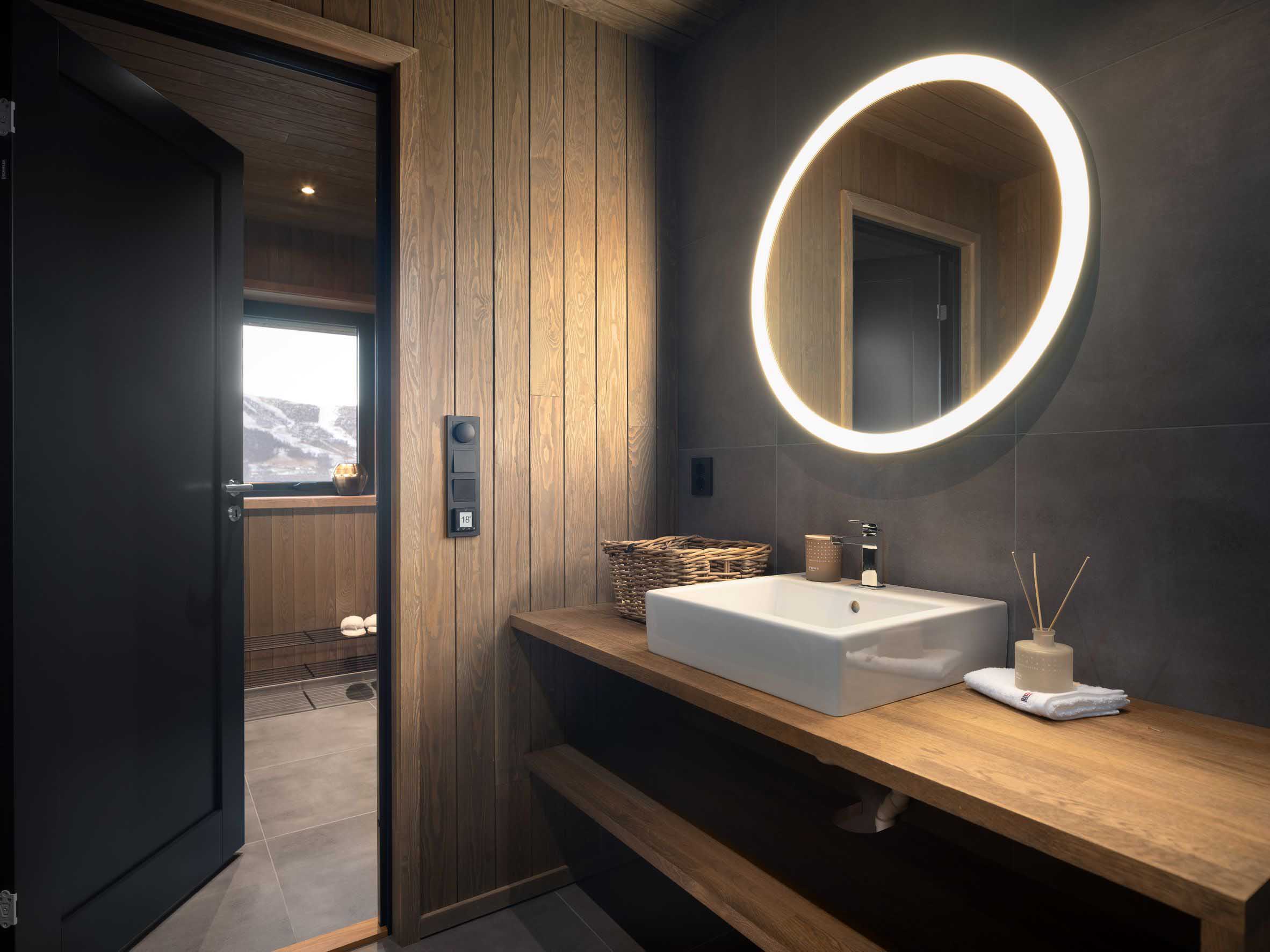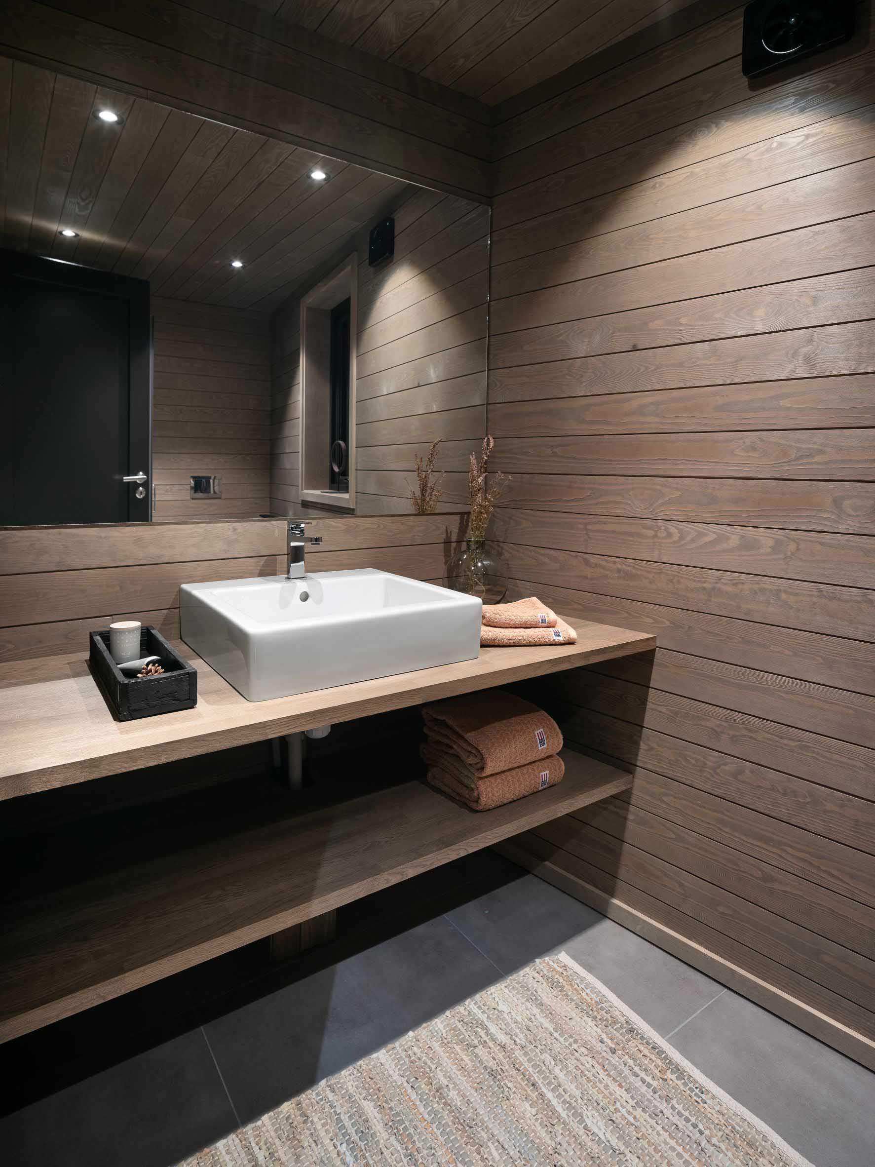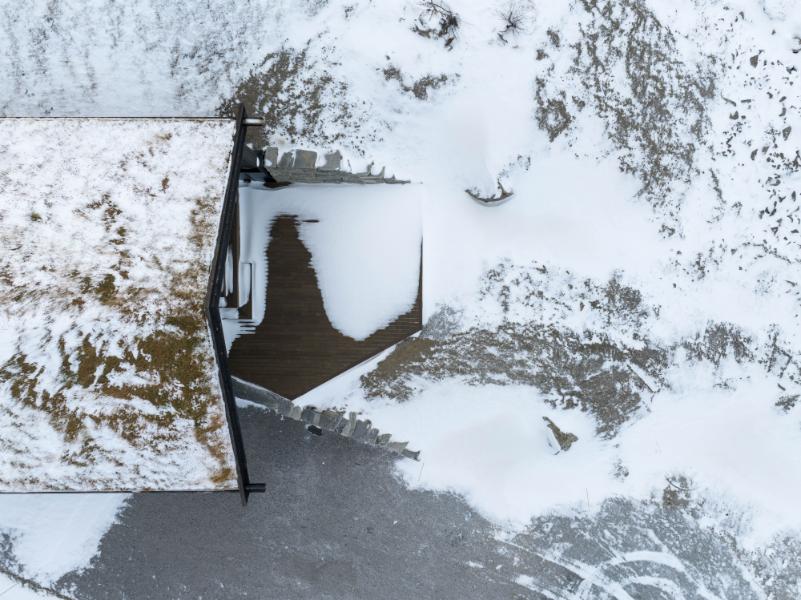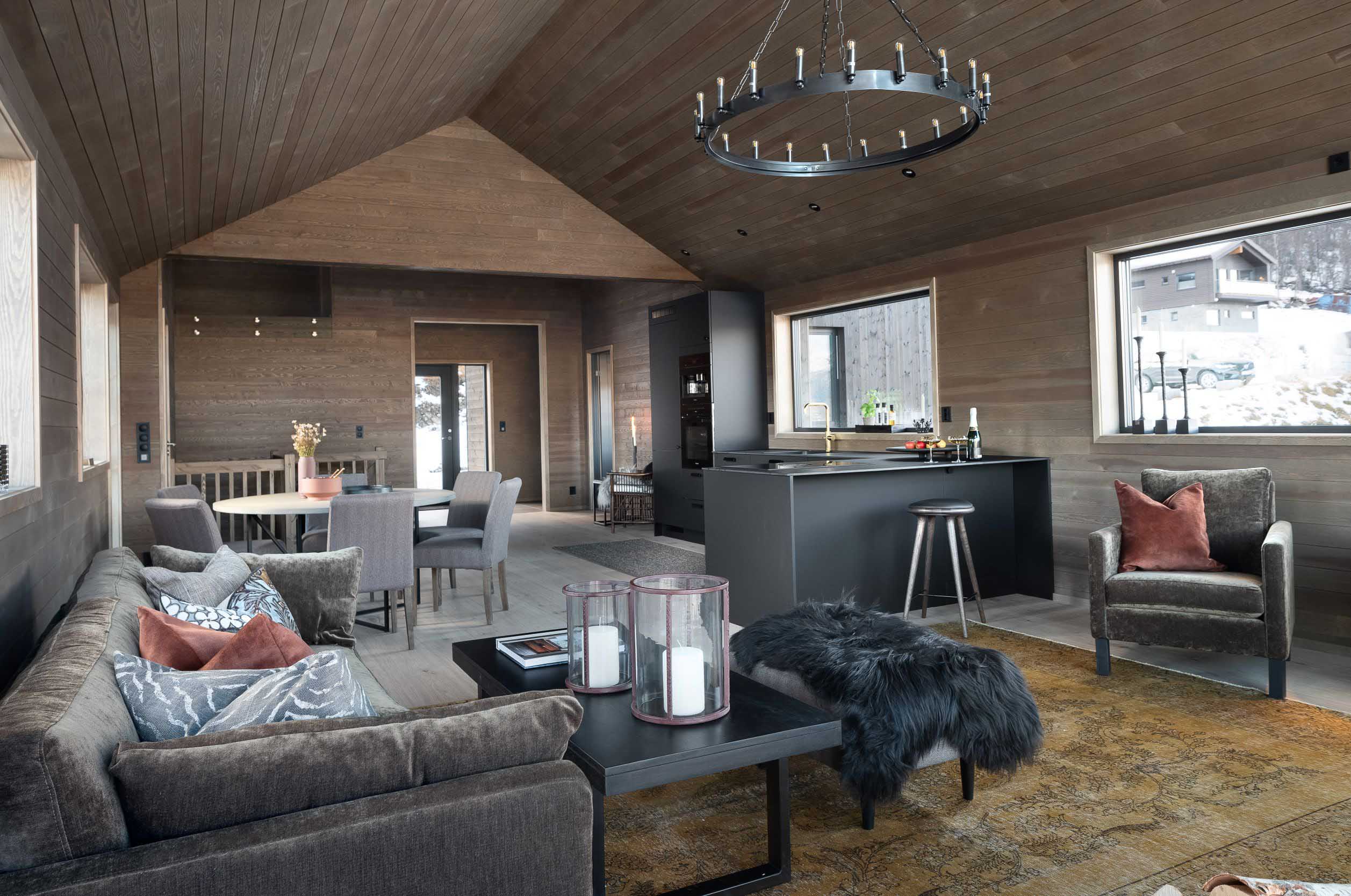 De skrå, men enkle formene gjør at hyttene glir godt inn i landskapet på en god og naturlig måte. Formene er blant annet inspirert av en snøplog, og den sømløse arkitekturen skaper et inntrykk av et robust bygg som tåler vær og vind. Store vindusflater og god takhøyde gir følelse av luft og fjell.